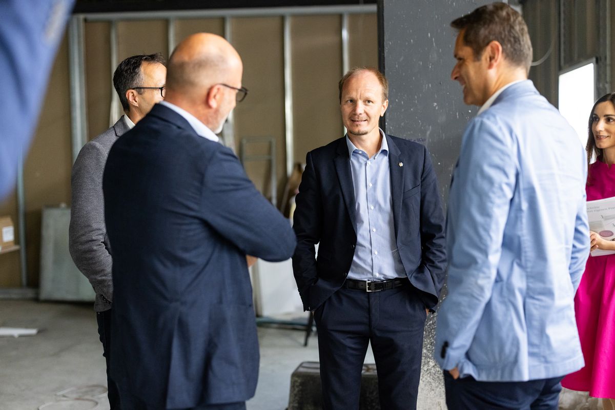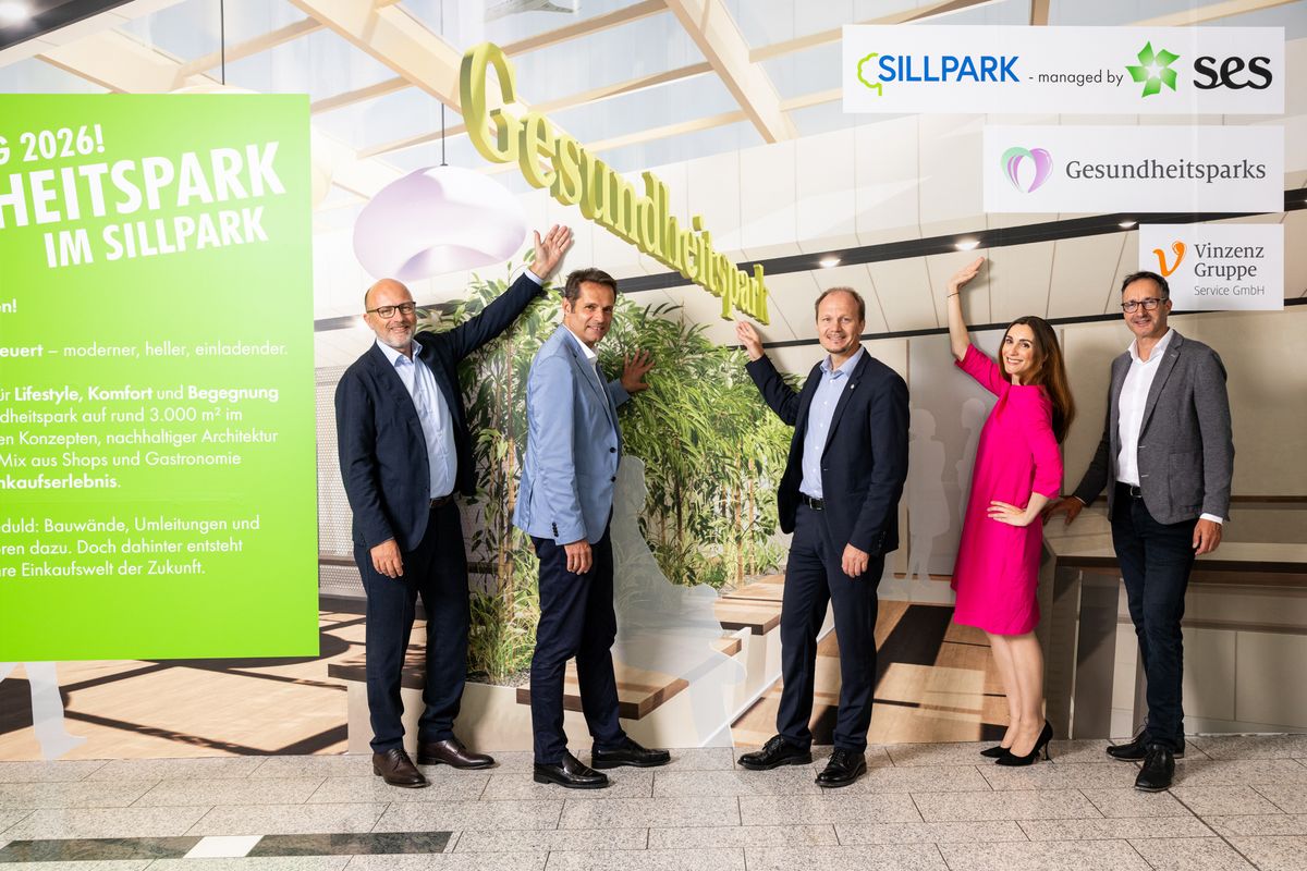 Am Bild (v.l.n.r.): Mag. Christoph Andexlinger (CEO SES), Dr. Michael Heinisch (CEO Vinzenz Gruppe Service), Mag. Johannes Anzengruber BSc. (Bürgermeister Innsbruck), Sigrid Miksch, MSc. (Geschäftsführerin Joint Venture TWOmorrow Gesundheit GmbH) und MMAg. Markus Siedl (Center-Manager SILLPARK Innsbruck)