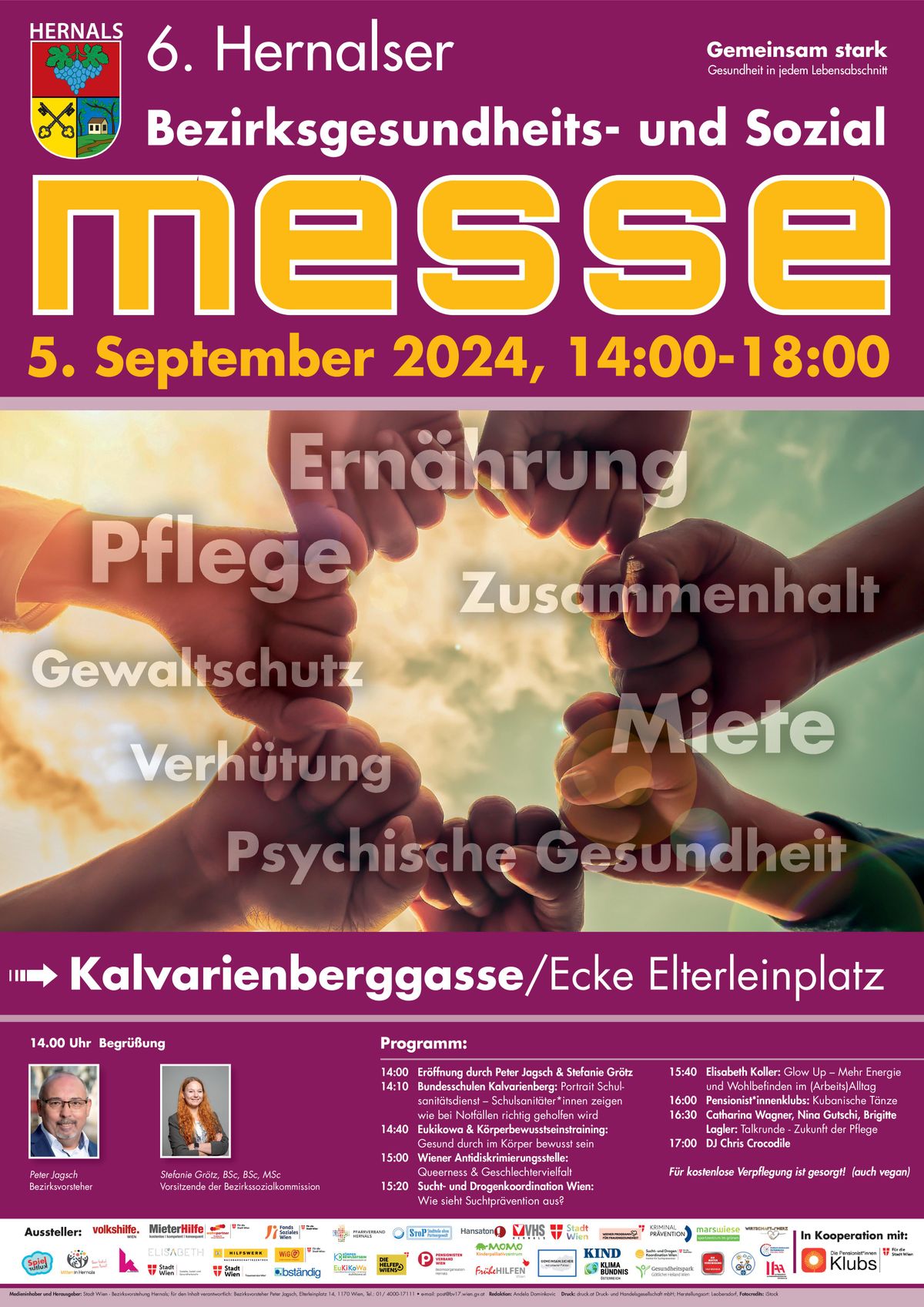Am Donnerstag, den 5. September 2024 findet von 14 bis 18 Uhr in der Kalvarienberggasse, Ecke Elterleinplatz, in Hernals die 6. Hernalser Bezirksgesundheits- und Sozialmesse statt. Die Veranstaltung bietet ein buntes Programm mit Vorträgen und Mitmachstationen rund um die Themen Gesundheit und Soziales.