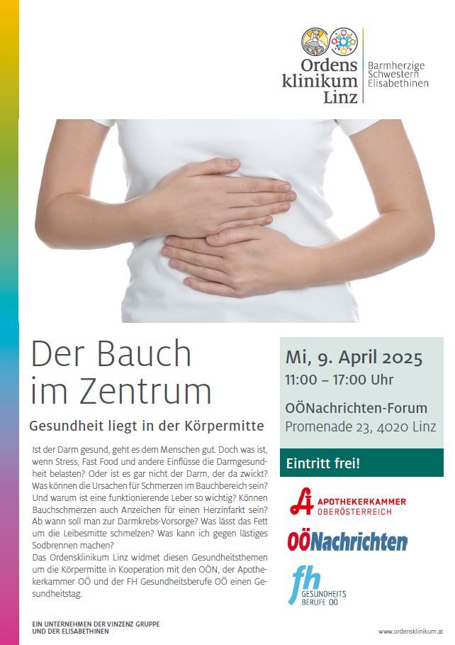 Unter dem Motto „Der Bauch im Zentrum“ erwartet dich am Mittwoch, 9. April 2025, von 11 bis 17 Uhr im OÖNachrichten-Forum (Promenadengalerien Linz) ein abwechslungsreiches Bühnenprogramm mit Expertinnen* und Experten*.