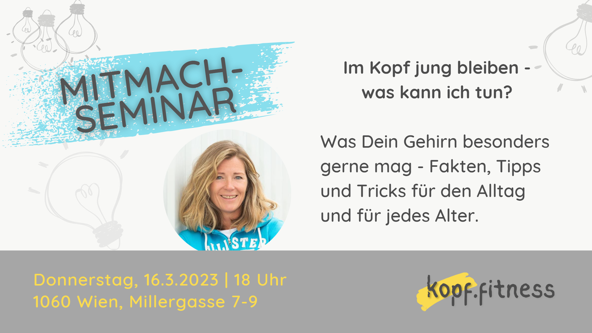 Am Donnerstag, 16. März 2023, 18 Uhr lädt Gehirntrainerin Verena Jura (kopf.fitness) zum Workshop „Im Kopf jung bleiben – was kann ich tun?“ in den Gesundheitspark-Standort Millergasse 7-9.